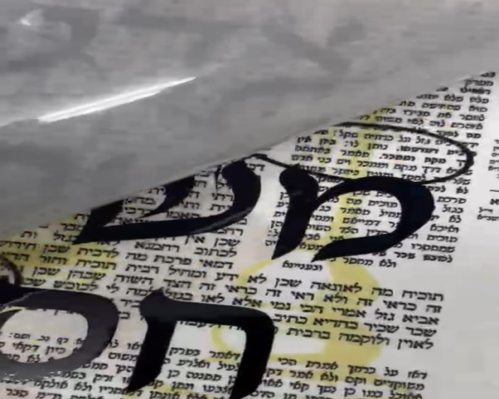 החומר שנצרב מן הבד הותיר את האותיות שקופות, נטמעות בתוך הטקסטיל, נדמות כמרחפות וזוהרות בחלל הבד. הבד עבר קימוט בחום וצביעה בטכניקות טבעיות, שהעניקו לו מראה מיושן, אך כזה השומר על תפארת הדף ותחושת קדושה.