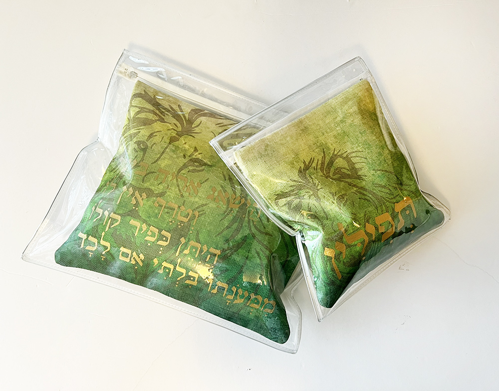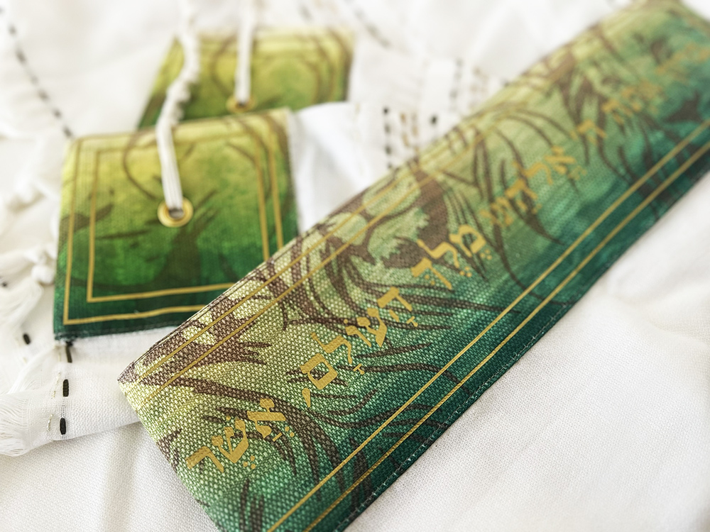 המוטיב הזה לא נעצר שם; בחלקם האחורי של התיקים הוא הופך לטקסטורה עדינה המלווה גם את עטרת הטלית ואת כנפות הציצית, בשילוב דפוסי זהב במראה מט.