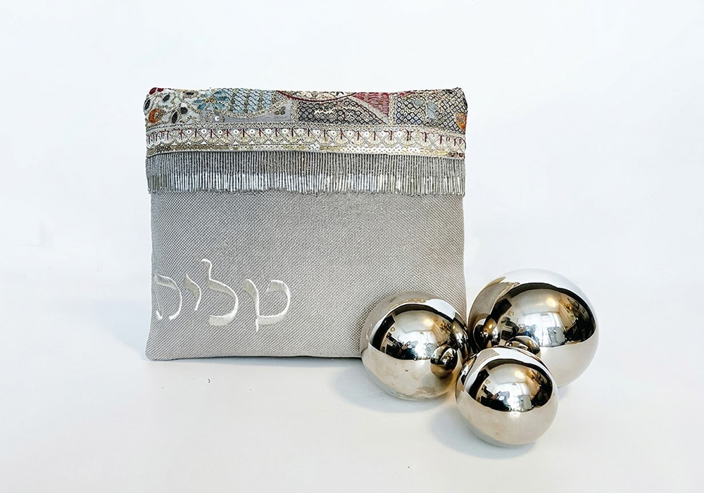 תיק לטלית בעיצוב גזרה חדשה וייחודית צורת טרפז עדינה המשלב חומרי גלם משובחים ורקמות וגדילי חרוזים