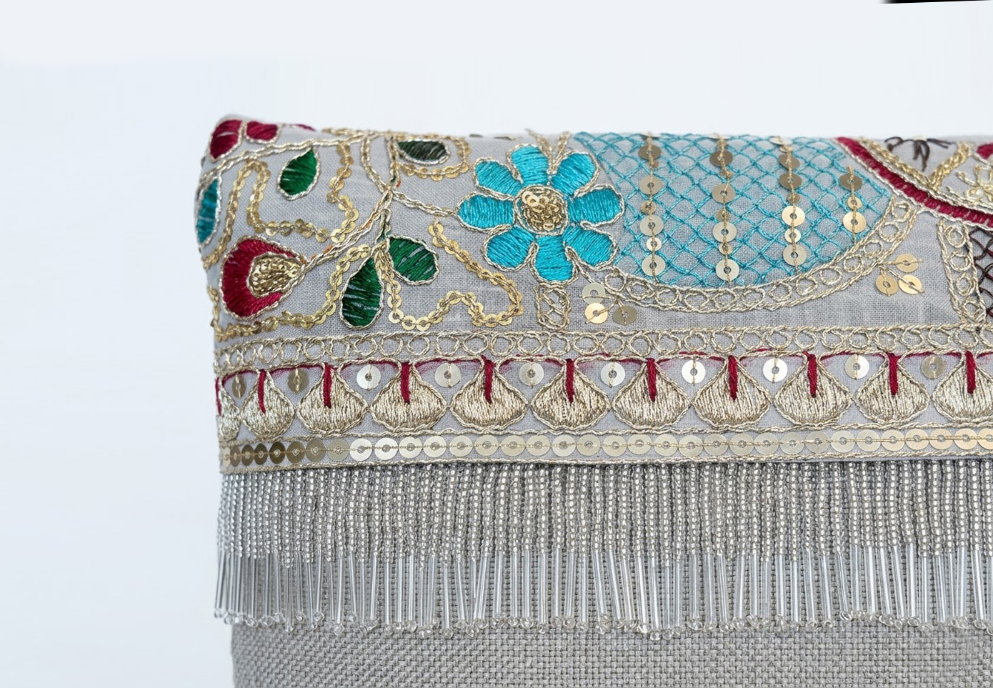 תיק בד במראה פשתן טבעי, ועליו בורדר אתני עשיר המשלב רקמה צבעונית, פאייטים וחרוזים.