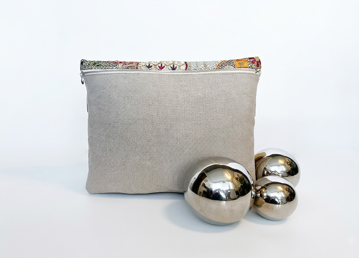 התיק מאופיין במשחקי טקסטורות בין הבד הגולמי לעיטורים העדינים, וגימור  גדילי חרוזים וחרוזי כסף המעניקים לט תנועה ןמראה חגיגי ומוקפד.